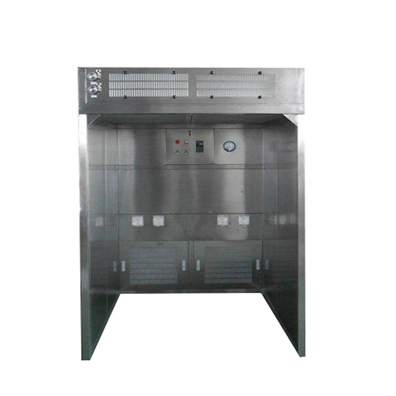 本设备采用垂直单向流的气流形式,回风先要通过初效过滤器进行预过滤,将气流中的大颗粒粉尘粒子处理掉,。经过预处理后的空气,再经过中效过滤器进行二次过滤,以起到充分保护高效过滤器的作用。在离心风机提供的压力下,通过高效过滤器,使之达到洁净要求。洁净气流被送至送风箱体内,90%通过均流送风网板,形成均匀的垂直送风气流,10%则通过风量调节板,排出设备。所有气流均经过高效过滤器处理,所以送风,排风均不带残余粉尘,避免了二次污染。由于在工作区域形成稳定的单向流,在此区域中散发的粉尘,会在单向气流的影响下,随着气流而被初、中效过滤器所捕集。设备带有10%的排风,从而形成相对与外部环境的负压,从一定程度上保证了此区域内的粉尘不会扩散至室外,起到保护外部环境的作用。